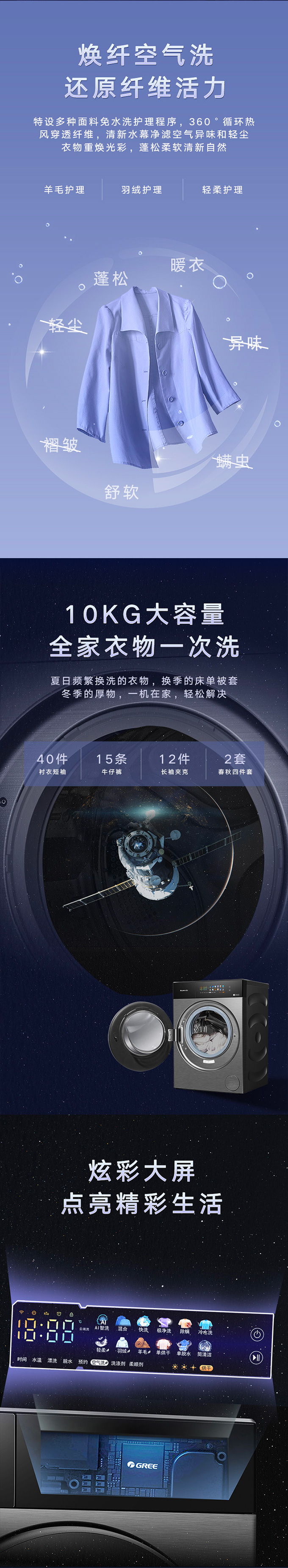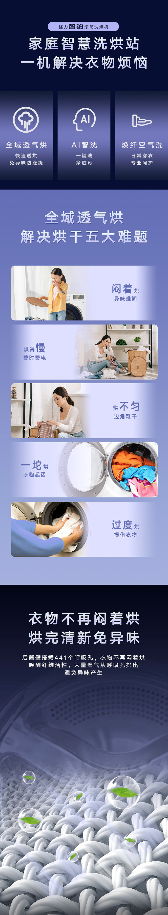 全域透气烘,衣物不在闷着烘。AI智能感应,脏污一键洗净。